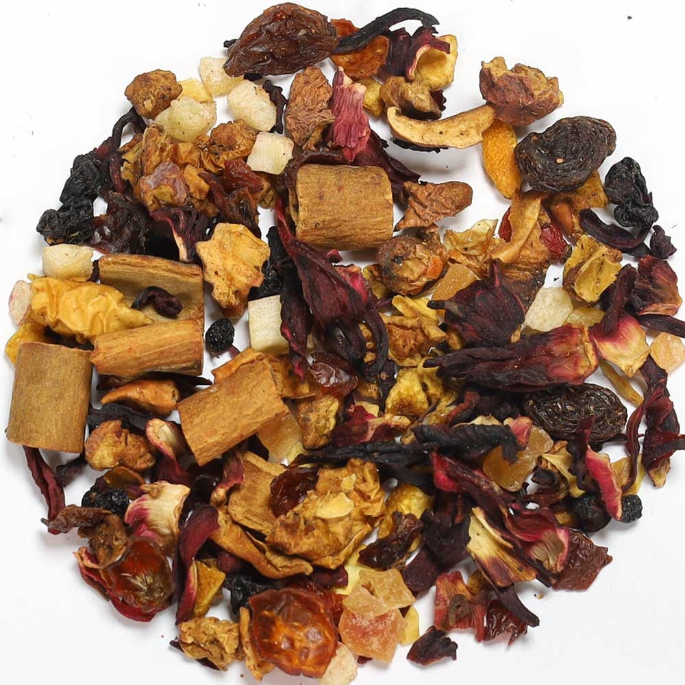 - Ingrediënten Stukjes appel, hibiscus, rozijnen, ananas rozebottel, kaneel, sinaasappelschil, zwarte bessen, vlierbessen